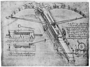Leonardo’s plans for his giant crossbow appear in the Codex Atlanticus, the largest of the codexes. The crossbow is enormous. Unfortunately, like the rest of his military inventions, it was never built…. until 2002.