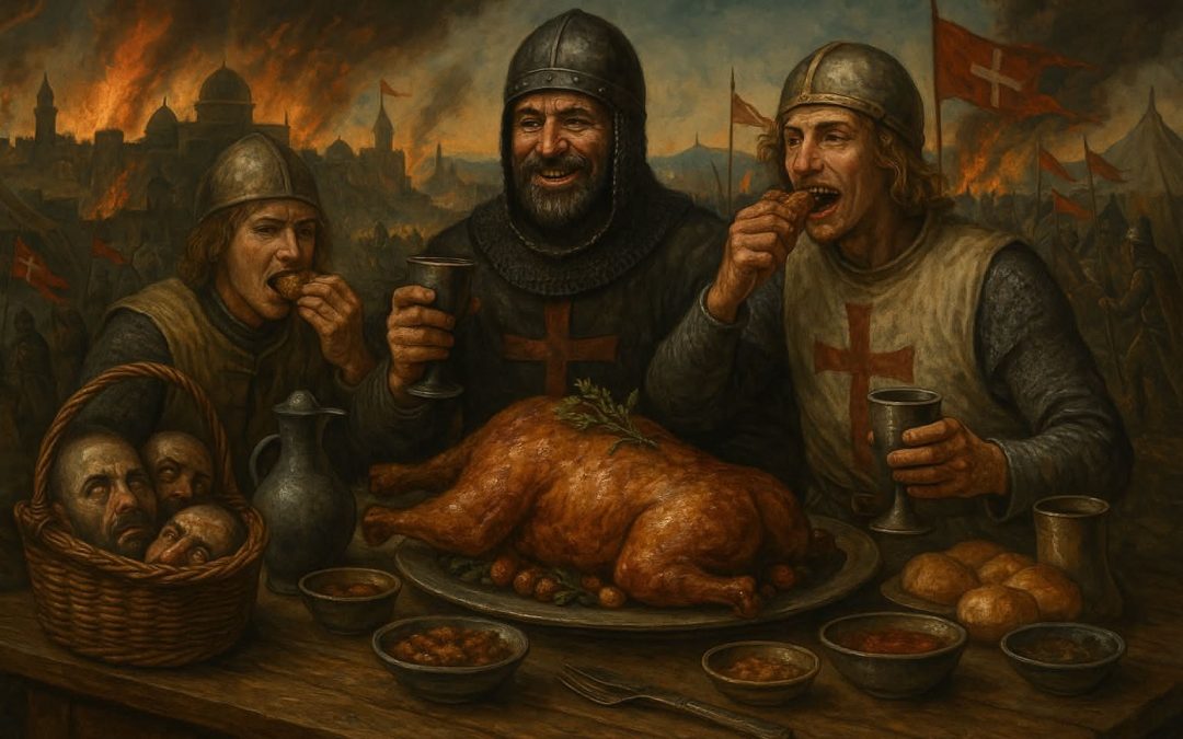 In this darkly hilarious and horrifying episode, Cam and Ray dive deep into the Crusades—specifically the winter of 1098–1099—where starvation and power games took centre stage. The guys discuss Bohemond’s Machiavellian brilliance in manipulating both Muslims and fellow Crusaders, the siege of Ma’arrat al-Numan, and the desperate, documented acts of cannibalism that shocked even medieval chroniclers. Along the way, they ponder cannibalism’s evolutionary logic, debate its moral context, and detail the fine art of seasoning a human rump roast. There’s also an impromptu history of “giving head,” strategic gift-giving via severed Turkish skulls, and slippery slopes into tyranny and baby BBQs. It’s one of the wildest, funniest, and most unsettling episodes of the Renaissance Times yet.